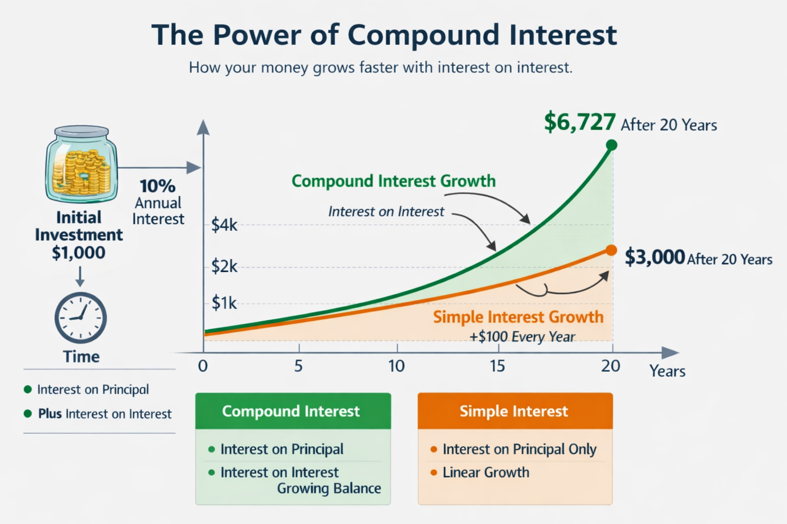 Unlike simple interest — which is calculated only on the principal — compound interest allows money to grow at an accelerating rate over time. This compounding effect is what makes long-term investing so powerful.